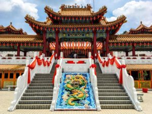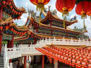 東南アジア最大級の規模を誇る天后聖母廟の一つであり、赤柱や竜の彫刻、瑠璃瓦や精緻な装飾が特徴的な寺院。丘の上に建つため眺望がよく、市内を見渡すことができるのも魅力です。正月や中秋節など華人の祭礼時には多くの参拝者が訪れ、舞獅(ライオンダンス)などが見られることも。