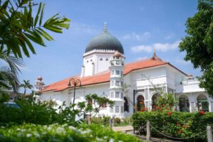 カピタン・クリン・モスクは、1801年に南インド系ムスリム商人コミュニティによって創建された歴史的モスクです。「Kapitan」は当時のコミュニティ指導者を指す称号であり、植民地期におけるムスリム商人の社会的地位を示しています。現在の建物は1910年代に再建されたもので、白いドームとミナレットが特徴的です。ジョージタウン旧市街の宗教建築群の中でも目を引くデザインです。
