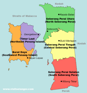 ペナン州は、ペナン島(Pulau Pinang)と本土側のSeberang Peraiの2地域から構成されています。